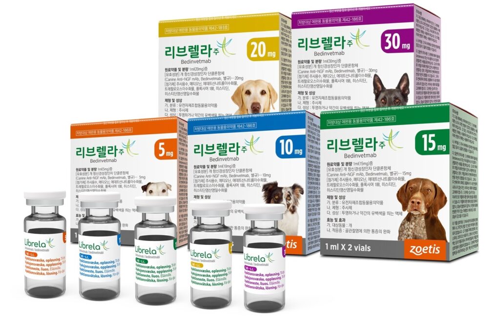 리브렐라는 ‘모놀로날 항체(monoclonal antibody)’라는 최신 생물학적 제제입니다. 쉽게 말해, 통증을 일으키는 단백질을 선택적으로 억제하는 항체 치료제라고 볼 수 있습니다. 주성분은 ‘베두카누맙(Bedinvetmab)’으로, NGF(신경성장인자)라는 통증 신호 단백질과 결합해 그 작용을 차단합니다. 기존의 진통제(NSAIDs)는 위장 장애나 신장, 간에 부담을 줄 수 있었지만, 리브렐라는 몸의 염증 반응을 직접 억제하지 않으면서 통증 신호만 선택적으로 차단하기 때문에 장기적인 사용에도 비교적 안전하다는 장점이 있습니다.